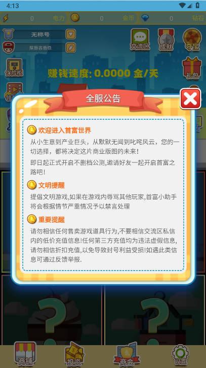 我要当首富采用了0撸的游戏模式,玩家无需任何经济投入即可开始游戏。新人玩家还可以领取2000钻石和30000电力,这样的奖励足够支撑你每天赚取1圆以上的收入。同时,游戏没有任何广告干扰,让你体验纯粹的赚钱过程。