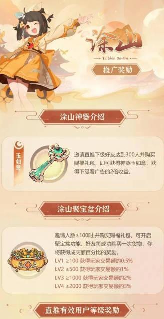 邀请人数≥100时,并购买赐福礼包,可开启聚宝盆功能。好友每成功购买一次货物,你将获得成交额百分比的奖励。