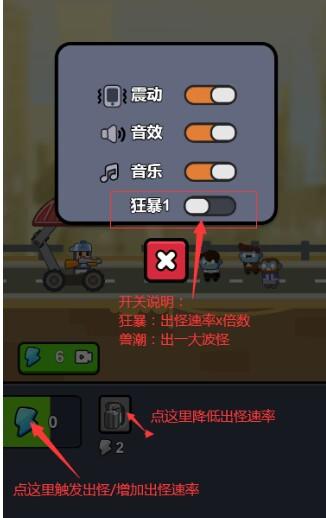 设置界面开启后,点击开关切换模式,点击能量处刷怪/切换狂暴等级【额外的怪没有攻击力仅是表现】