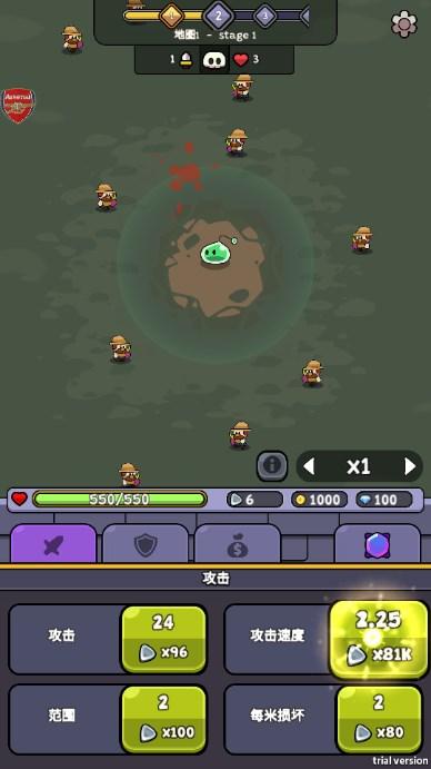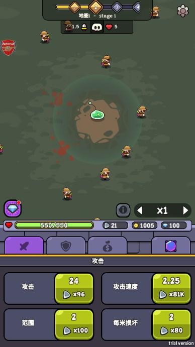 1、下载安装该游戏的最新版,打开进入游戏点击绿色按钮可升级史莱姆的攻击力。