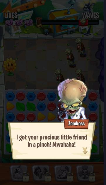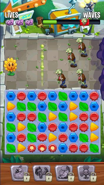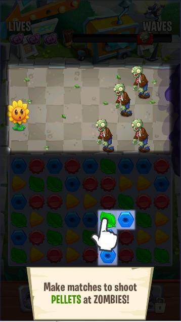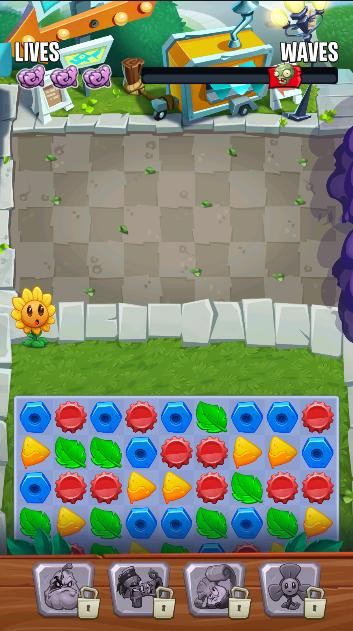 特殊战斗关卡,匹配三种植物向逼近的僵尸发射弹丸。