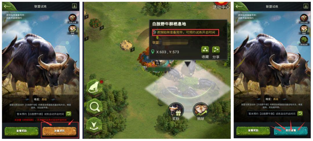 白肢野牛群试练攻打阶段:联盟成员可以参与试练,与白肢野牛群战斗。战斗过程中不会产生重伤和阵亡野兽,仅产生轻伤野兽,战斗结束后,轻伤野兽自动治愈。这个阶段结束后,活动会重新开始下一个诱饵陷阱准备阶段。