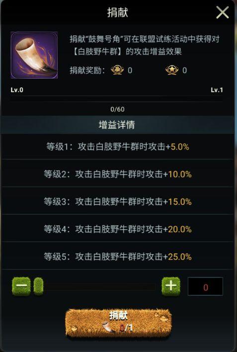 增益BUFF:捐献可以提升攻击增益BUFF等级,最高5级(等级1级攻击白肢野牛群时+5%,每升级1级提升5%,最高25%加成)。