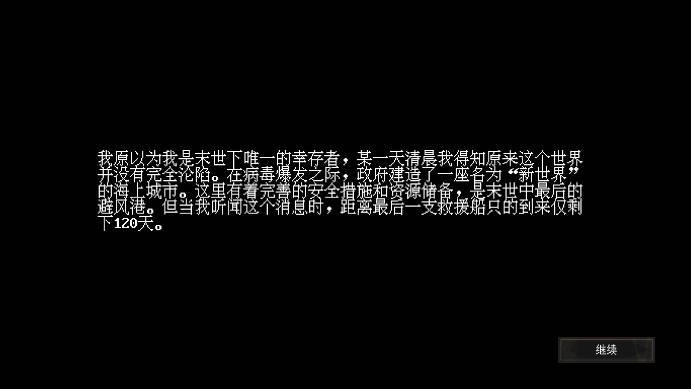 早已落满灰尘的无线通讯设备在某一天清晨恢复了信号。从电台中得知原来这个世界并没有完全沦陷。在病毒爆发之际,政府建造了一座名为“新世界”的海上城市。这里有着完善的安全措施和资源储备,是末世中最后的避风港。但当我听闻这个消息时,距离最后一支救援船只的到来仅剩下120天。