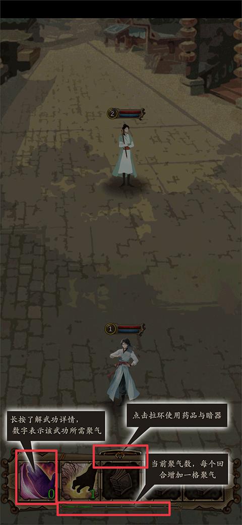 3、剧情进行时还会触发战斗任务,长按招式图标可以了解武功详情,数字代表该武功需要的聚气,下方绿色格子就是聚气数,点击拉环使用药品与暗器