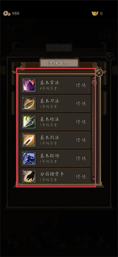 5、另外在修炼界面中,玩家还可以通过修炼武功来增加技能