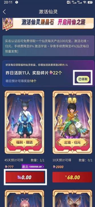 在问仙记中,每位新玩家都可以免费激活一个仙灵。玩家无需任何花费,0圆购置仙灵后,即可开始领取收益。激活后的仙灵将会为玩家带来每日的收益,并自动生成碎片。