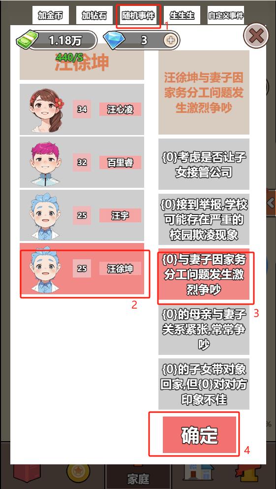 3、随机事件:可以通过指定家庭成员来触发某个事件,便于录制相关事件的素材