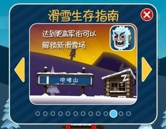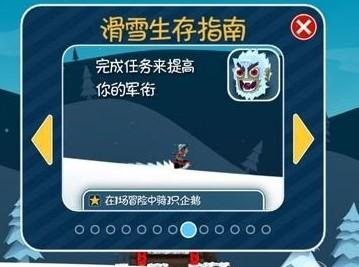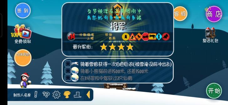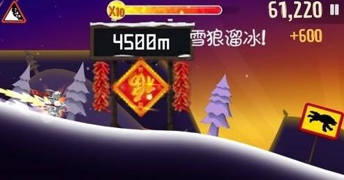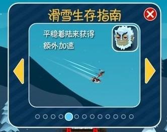 接着,在屏幕上方会有当前玩家获得奖励状态,玩家可以通过在滑行中收集金币奖励、完成高难度动作等获取奖励状态,这样就可以激活游戏中的高级工具,例如火箭船等,还可以和企鹅、雪怪人一同搭载着火箭船奔向远方。