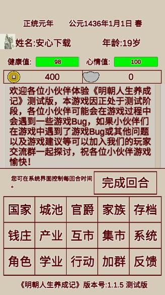 《明朝人生养成记》是一款以明朝为基础题材,模拟、经营、养成为玩法的单机文字游戏,在这里您可入朝为官,实现抱负,亦可夺取天下,万世传承,或可经商种田,腰缠万贯,游戏过程中将会按照历史时间节点更替皇位,体现王朝的更替与传承,同时也会出现很多的历史事件,体现时代的风云变幻,将您重新带回那个风起云涌的“大明王朝”!