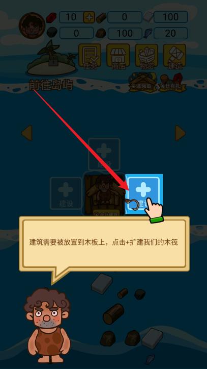 6、建筑需要被放置到木板上,点击+扩建我们的木筏