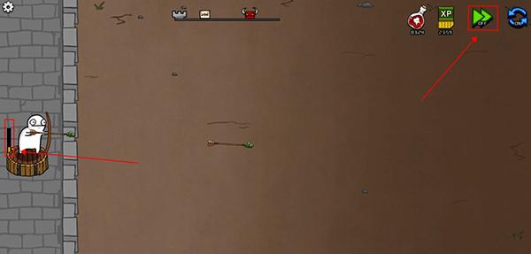 2、进入关卡后,游戏角色会自动发射弓箭攻击,攻击敌人会积攒怒气,满格后可以提高攻速,玩家也有点击右上角的绿色加速按钮加快游戏速度。