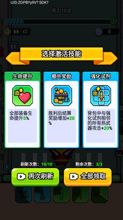 2、通过免广告刷新各种背包格子可以放置更多的武器