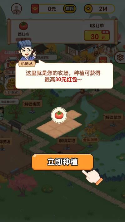 农趣乐耕是种植玩法,如果能正常看视频的话可以多玩玩,看不了视频的就做一个订单拿0.1吧。模拟了真实种地的趣味游戏,画面是非常卡通的,大家需要经营自己的农场,玩家种上自己喜欢的农作到浇水施肥,再到收获,新人注册可以送你一颗小白菜,农趣乐耕红包版操作简单,,让你成为这片养殖场的小主人,并且获取红包作为奖励。