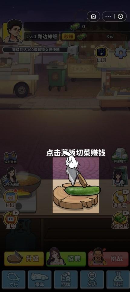 食神的逆袭游戏免广告获取奖励是一个疯狂点击屏幕切菜赚钱的小游戏,成为食神的路上免不了其他人的帮助,你需要招募的助手帮助你完成赚钱,赚钱提升我们的角色等级和职称,疯狂点击屏幕即可,游戏玩法非常丰富,点击屏幕就可以获取大量钞票,解锁免广告。
