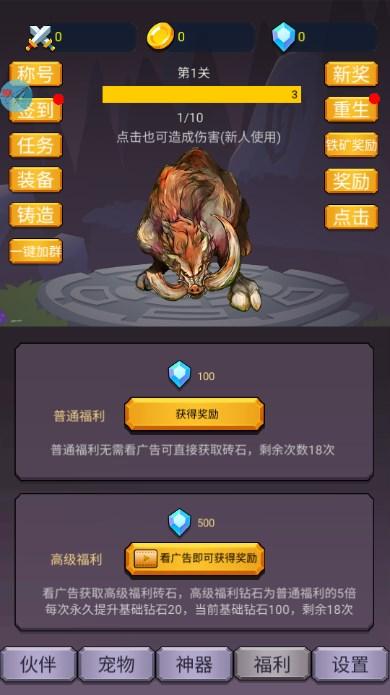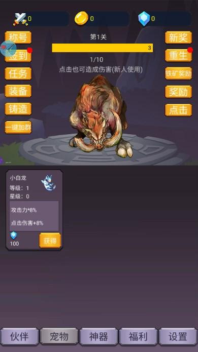 这是一款放置挂机的游戏,铸造、装备、重生、伙伴、宠物、神器、签到、任务等等功能等你来探索。因为是一人团队美术,有很多不足之处,还请多多谅解和多多包涵!有什么问题可以到群里找我说,有什么建议也可以跟我提出来,希望大家喜欢!