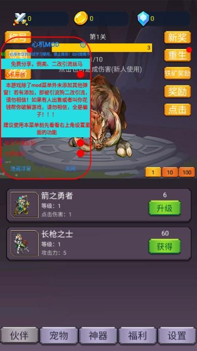 转生勇者打魔王内置心机BOY菜单版是一款类似于木鱼的挂机游戏,在这里你需要疯狂点击屏幕,攻击对方目标,然后可以获取各种各样的道具,游戏总体上来说是一款放置点击挂机类型的游戏,解锁心机boy菜单,无限金币钻石不减反增。
