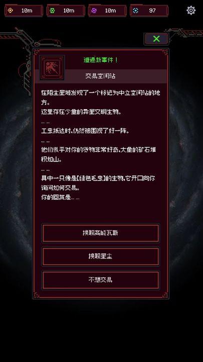 3)探索:进入探索,可以探索到突发事件,需要主宰们选择后获得相应奖励,有随机概率会探索到新的星球,可以果断开新星球,开采新矿场。