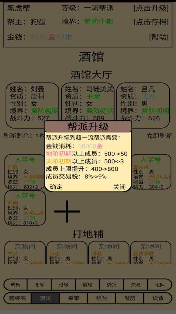 一个模拟帮派经营的游戏,游戏内可以招募帮派成员为你打工,里面做了一些简单的帮派成员AI行为。比如成员直接可以相互组队挑战地图,自动挑选适合自身的功法装备,并且可以将自身掉落物品材料相互交易,收购需要的材料自行炼丹炼器等等,帮派可以在成员交易中获得相应的交易税收。玩家也可以多多提升帮派建筑,为成员提供便利的同时也可以获得可观的收益。还有一些方面也不好一一列举了