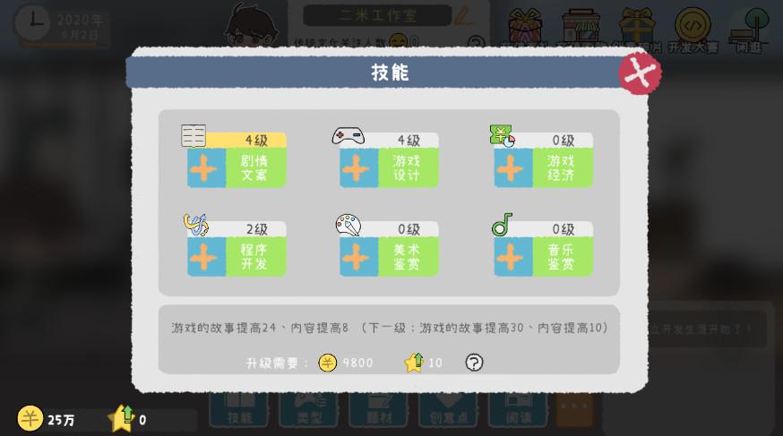 所以对于这款游戏整体的体验效果中规中矩,并且因为对于开头没有任何指引的原因,整体的体验过程也较为一般,并没有任何需要玩家所进行更好游玩过程的地方,比如对于游戏的开头,的确会拥有对应的新手教程,也会通过文字和指认的方式来告知玩家如何进行选择,但是,这些基本都是以最基础的方式来进行告知,比如告诉玩家如何添加点数或者如何进行制作游戏,这种过层基本可以认为,完事之后游戏就会没有任何的教程和体验的过程,但是很明显能让玩家知道的地方就是如果想要在游戏当中能把我们制作的作品提高分数,卖出更多的人量,就必须通过持续升级我们所需要的属性和各方面的宣传,必须的选择,但是这个过程体验下来很多都是需要玩家所进行强制类型的观看广告才能进行实现,或者是通过更多所需要玩家的努力或者不平衡的体验才能真正的实现属性的提升,所以游戏目前对于各方面的射击感觉尤其所进行学习,消耗对应的金钱和所需要的体力感觉非常的费劲。