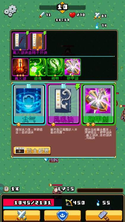 玩家在击败一定数量敌人升级之后就可以选择一个技能学习或者升级,不过这个技能看着挺让我迷糊的,新手指导说的也不太清楚,在游戏里也没看到蓝条和技能CD之类的设置,但玩着玩着总会出现一句释放万剑诀法力不足这种提示,玩了几局到现在甚至还不知道这个技能是主动触发的还是每隔一段时间自动触发的,要说是主动触发的话,我也不知道在哪用,所以我个人建议官方能够适当增加一下游戏中的新手指导详细度,字体本来就模糊,新手指导还含糊不清,让人玩着真的挺迷糊的