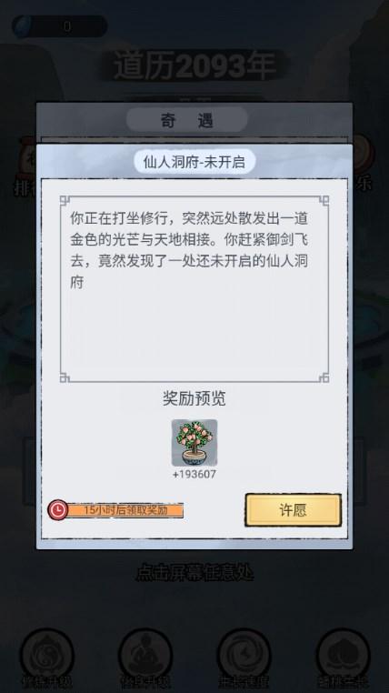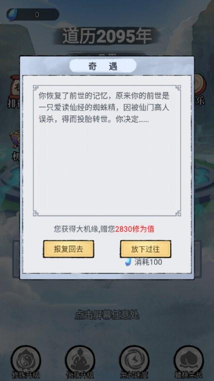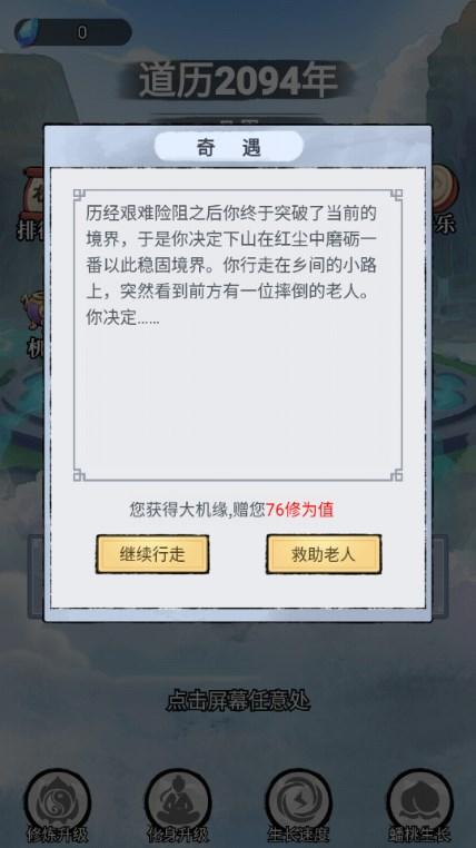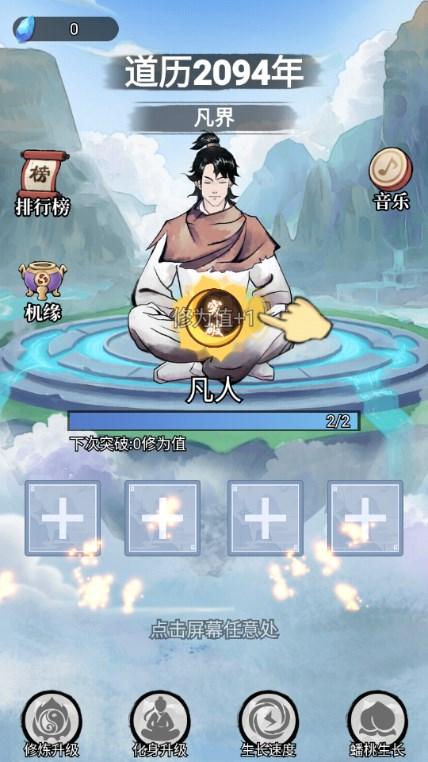 这是一款通过点击屏幕获取修为,待修为值到达一定数值后会让主界面上的凡人不断进阶到仙人的游戏。在游戏当中还可以通过解锁万千化身,和通过升级修炼速度,和喂食蟠桃来加速成仙的过程。