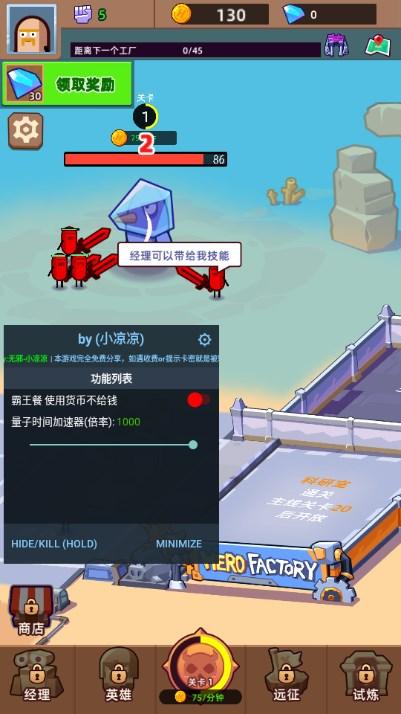 英雄工厂大亨内置无邪作弊全局加速版(com.hg.heromaking)是一款非常火爆的放置塔防类型的游戏,这个版本增加了无邪MOD菜单,可以进行游戏的加速,免费内购,和不减反增,功能非常多,是一个菜单中的功能,大家想要使用的时候将菜单功能打开即可。