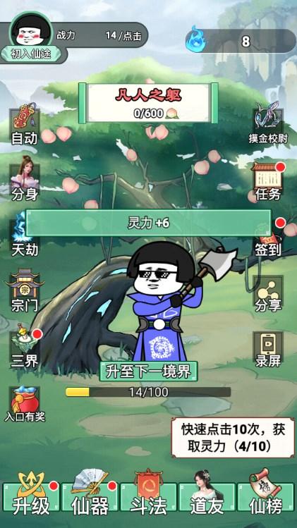 我渡劫特6免广告获取奖励(com.xzw.wdj.meta)是目前抖音比较火的一个小游戏,这个小游戏中我们需要扮演蘑菇头这里进行砍树修炼,修仙,游戏一步步成为最强的修仙用户,游戏解锁免广告获取奖励。