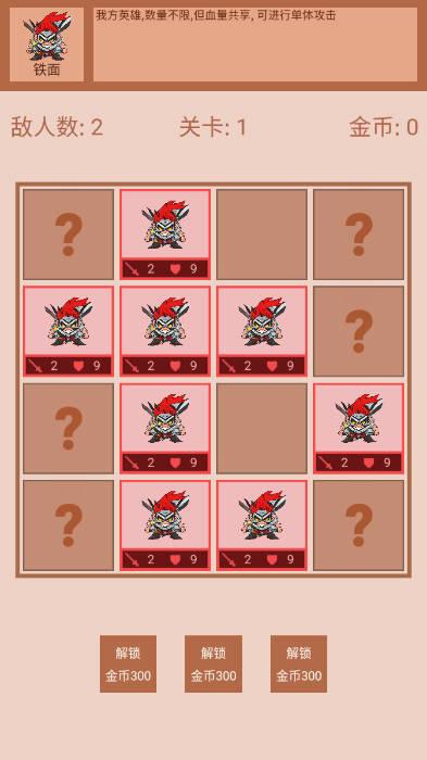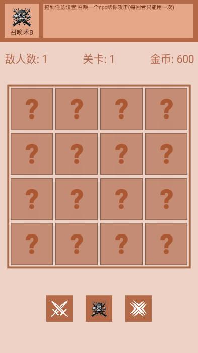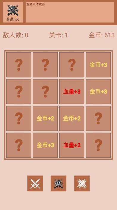 点击一个问号格子, 就会翻出一个敌人(怪物)攻击. 如果这个格子没有怪物, 那就会放置一个我方的英雄, 然后攻击