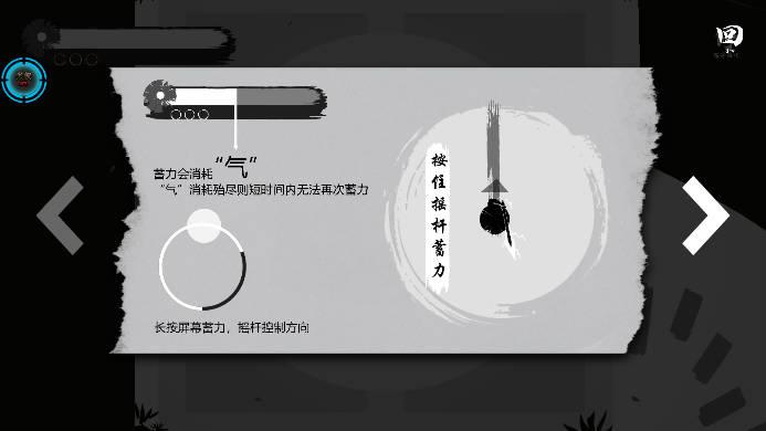 身处在水墨背景下,听着优美动听的音乐,确实是一种不错的享受。以上帝视角(即2D俯视视角)投身在一名侠客身上,用过摇杆控制蓄力来展现侠客的惊世骇俗的身手,一息一瞬尽在指尖间完成。