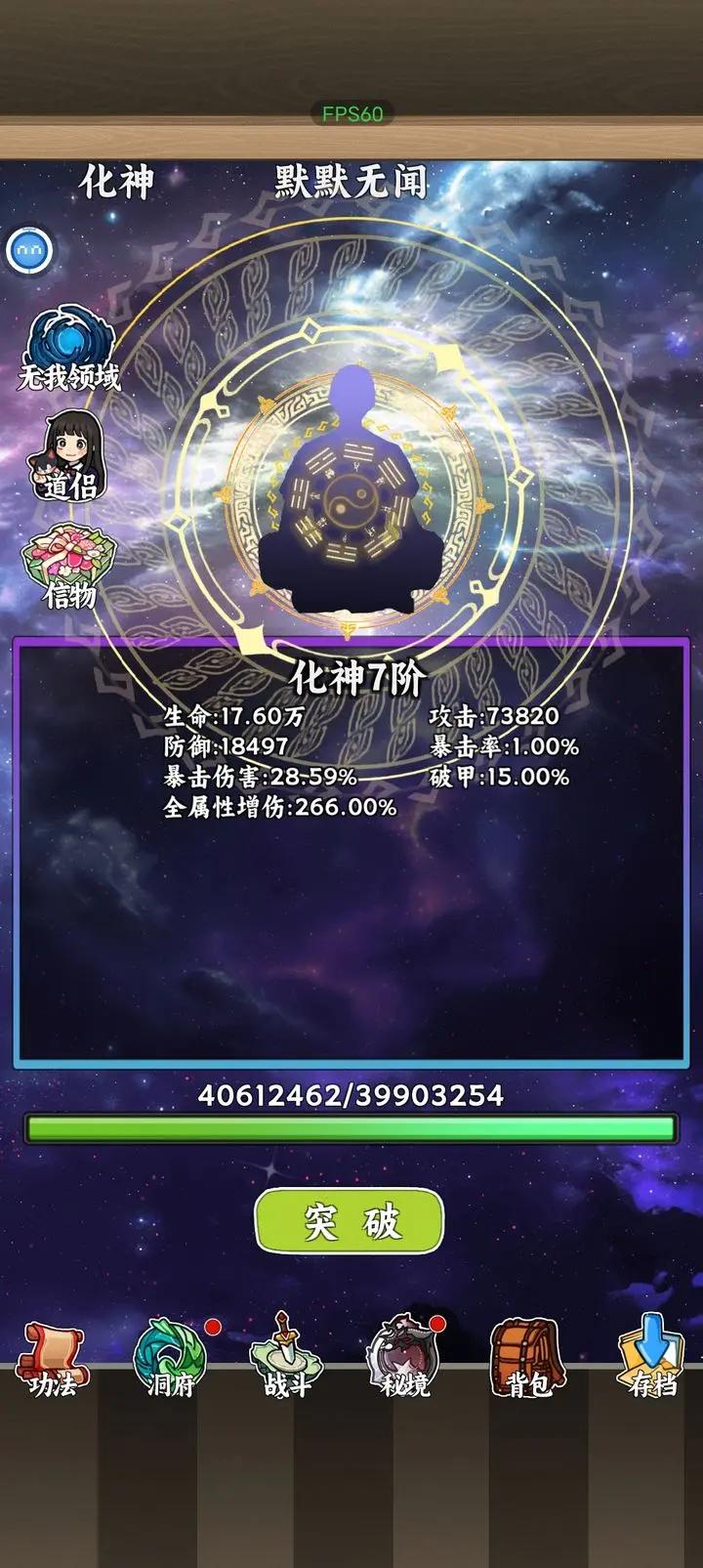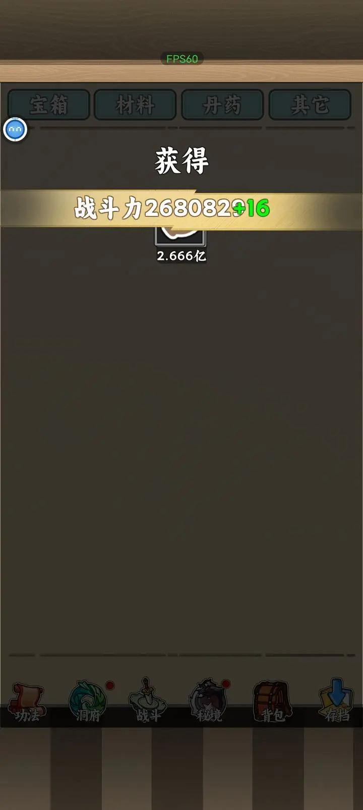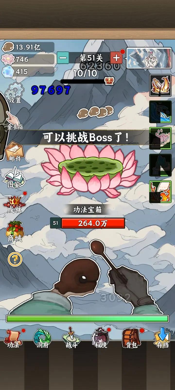 游戏的玩法很简单,有点像《咸鱼之王》一开始需要玩家疯狂点击屏幕对敌人造成伤害,随着玩家点击频率的提高攻击的速度也会越来越快。游戏中玩家提升伤害的方式可以通过提升修为并且突破境界的方式,不过升级较慢。也能通过升级木鱼以及功法的方式快速提升伤害,后续也能通过解锁信物增加一些属性。升级木鱼需要用到木鱼材料,对于功法的升级除了需要木鱼以外,由于功法的属性不同,对于功法的升级也需要不同属性的强化石。游戏中木鱼以及强化石的获取可以通过闯关开启宝箱获得,每打败10个敌人会随机遇到一个宝箱或者礼袋。每个宝箱和礼袋需要消耗一个的钥匙才能开启,并且消耗钥匙的数量不会随着宝箱阶级的提高而有所增加。游戏中每打败10只小怪就可以选择进入BOSS关卡挑战BOSS,如果玩家不选择挑战BOSS那么就会一直卡在同一关。BOSS相比于小怪就是血量更多,对玩家造成的伤害会有所提高。不过玩家不用担心血量问题,玩家的基础血量还是挺厚的并且在每次战斗前都会将血量恢复满,玩家不需要担心血量恢复会消耗玩家资源。玩家击杀BOSS后会获得大量的物质,以及一些正面bulf。游戏中的副本也能为玩家提供一些基础物资,并且玩家可以去历练寻找伴侣或者触发奇遇获取奖励。