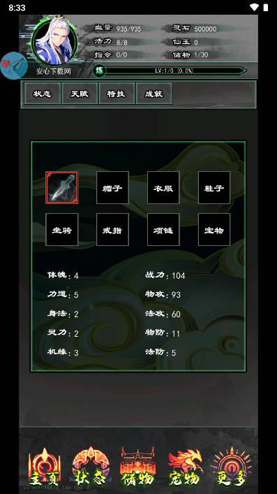 两个职业,剑士(主属性力道)和法师(主属性灵力),开局先把两个福利码领了(qq群和公众号各一个),装备打BOSS有任务可以领红装,没有必要买,点击左上角头像可以进入修仙界面,修仙界面心魔可以点击消灭,不消灭会降低经验获取