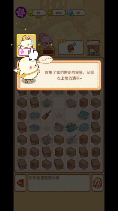 2.关于维修工具合成:有了工具箱点击得到工具后就可以开始合成维修工具啦——2只单只手套→1双手套 2双手套→1双装修手套,2个起钉器→1个扁口螺丝刀 2个扁口螺丝刀→1个外六角扳手 2个外六角扳手→1个钳子 2个钳子→1个扳手......以下类推。总结一下就是2个低级合成1个高级。(具体看订单需要什么就合成什么,也可以合成一些等待下一笔订单但是会占格子)