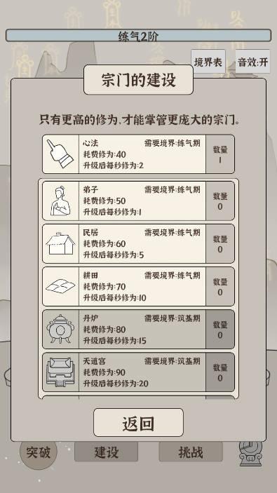 尽管游戏操作上很简单但还是改变不了游戏内容稀少的问题,游戏中只有两个内容宗门的建设和挑战宗门,而且游戏中境界只有十个很容易就能修炼到登仙阶,后面的境界完全没有做出任何补充。所以游戏体验上并没有给我太好的体验。