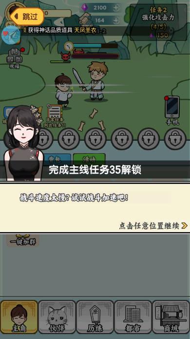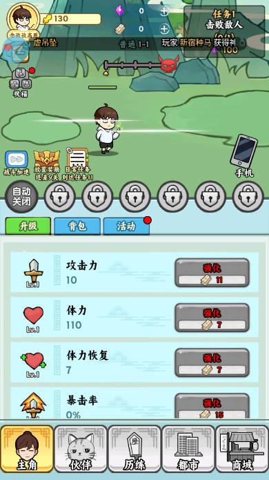 其中游戏展现出来的玩法,和我们所进行接触的挂机类型游戏都是一种相同的体验,玩家要通过不断的攻击屏幕当中的敌人过程,所进行获得其中的奖励,并且每一个任务都会拥有对应推进方面的要求,但是至少对于这款游戏,并没有添加自动挑战boss方面的按键,玩家是可以通过自身的选择,来挑战每一个章节方面的最终boss!