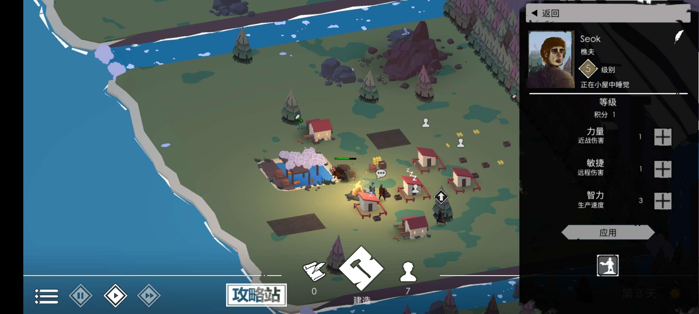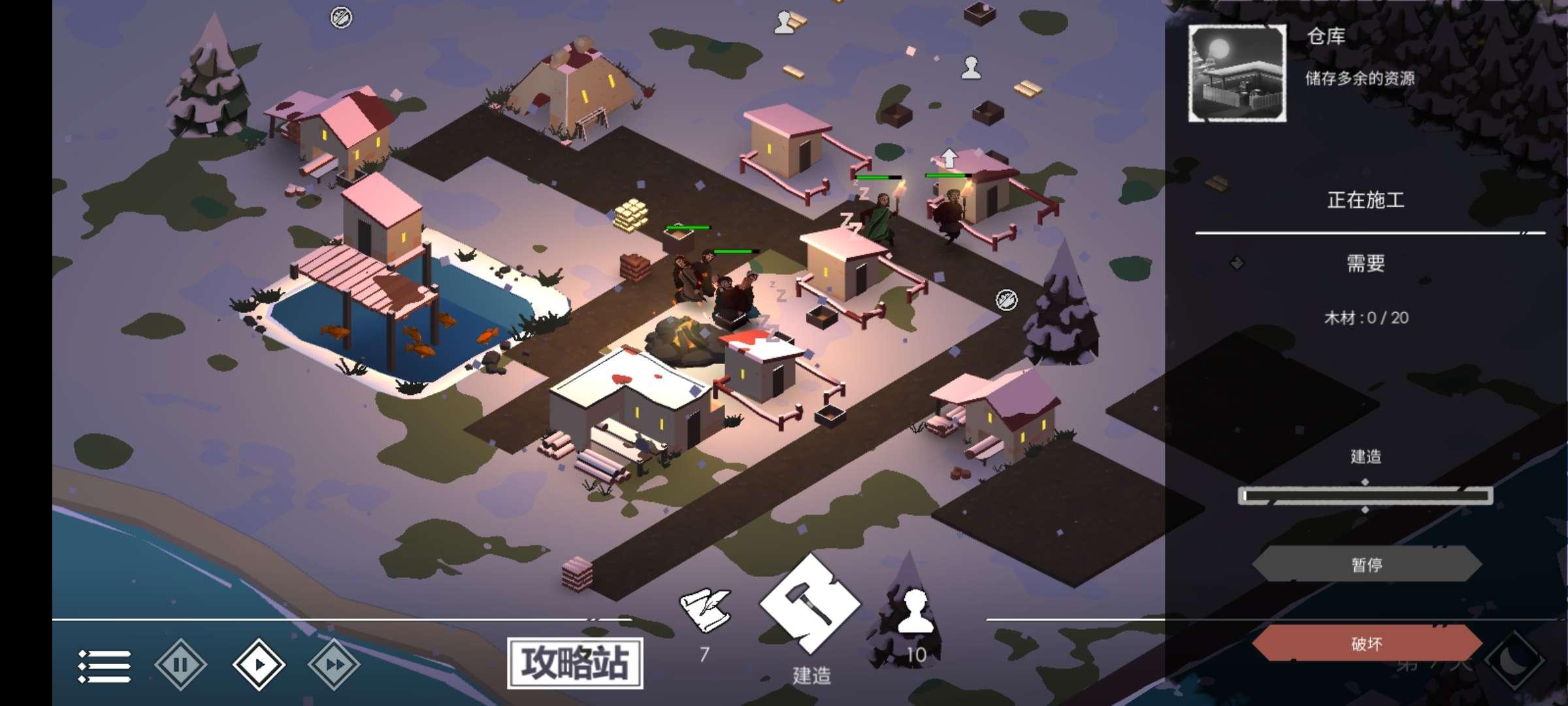 小屋需要使用10木材进行建造。工人可以在小屋中进行休息,恢复精力。没有小屋居住的工人将在篝火旁进行休息,在篝火旁休息的工人精力不会得到恢复,还可能遭受夜晚怪物的袭击,在小屋中休息可以躲避怪物袭击。建造足够的小屋有助于减少工人损失,小屋后续可以升级,一个小屋最多只能居住5人。