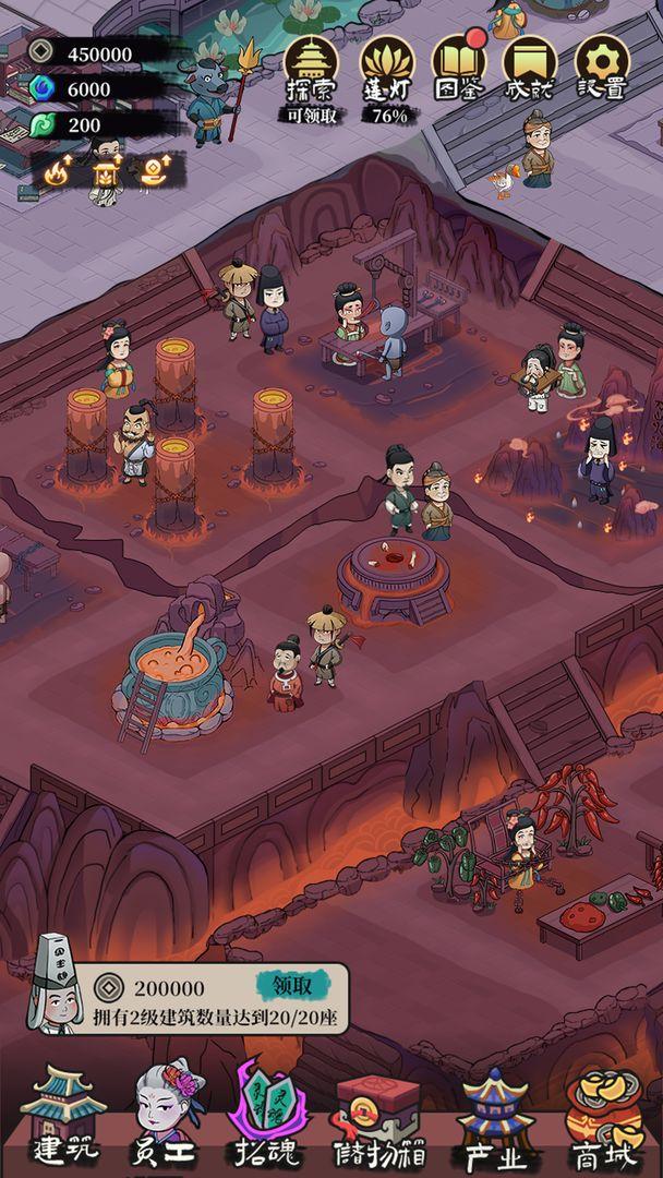 游戏画面可以看一下宣传截图,怎么说呢?还行吧,毕竟主题是地府对于地府的一些该有的刻画也都有,不过在刻画程度上,还是不屈于那种地府该有的恐怖这种氛围,而是相对更加缓和的一种情况。就感觉比较一般。虽然游戏玩法是经营一个地府,但实际上你要干的事情可以说是一只手都数得过来。基本上玩下来你就是需要来建造各种建筑物,然后挂机获得收益,就这样子。比如建造刀山火海区什么之类的,然后搞一口井,弄点忘情水什么的,然后做孟婆汤之类的这些方面的话,你基本上就是单纯的获得的钱币够了,然后直接当场建造。建造完你就可以什么都不用干了,就全自动的流程化。整个过程可以说是就,完全挂机。没什么太多的可玩性,基本上就是靠游戏的画风以及一些对话设计来增加一下视觉观感。比如在审判长这里会记录生前到底是怎么样子的,比如杀人放火呀之类的或者是偷盗抢劫,这些都会被记录下来,并且以悬浮字样的方式出现,来看这个人是善良的还是邪恶的。然后看着他去受刑。