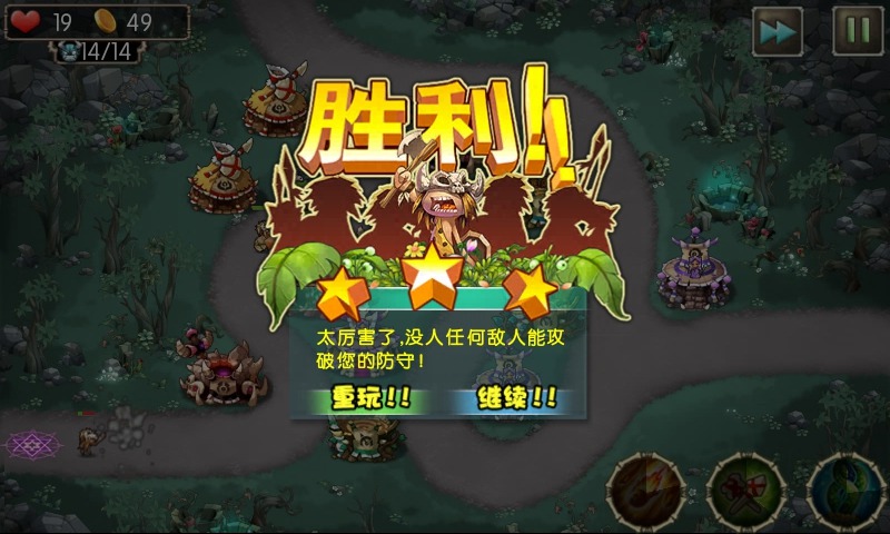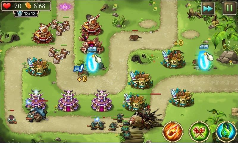 在防御塔之外还有特殊技能可以使用,魔法阵延缓敌人的动作,流星火雨是从天而降的火雨来攻击敌人,最好留在紧急情况或者最佳时机再使用,CD多达80秒。召唤丛林的力量也可以缠绕敌人,将它们困住并造成范围伤害,CD为45秒。杀死怪物获得金钱后,立刻建造新防御塔是最佳策略,而升级到不同等级的防御塔将具备不同的攻击力和特性。