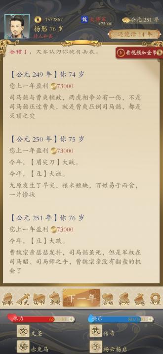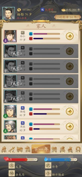 2.选择人生方向:是要辅佐君主治理地方成为贤臣?还是要征战沙场一统天下成为骁将?亦或是沉迷武力赢得御前比武大赛名震天下等等,不同的人生方向游戏内的侧重点会有所不同,从文从武或者归隐田园,一切皆有可能。