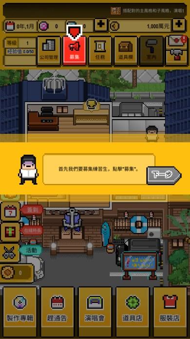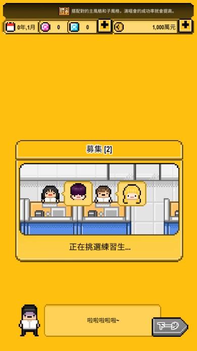首先从游戏的整体展开,玩家需要扮演团队的幕后老板,在众多练习生中进行选择以及培养。但是需要注意的地方就在于游戏的教程属于半强制性,因此在体验的时候就会很容易忽视掉跳过以及不确定自己跳过之后是否会影响整体,而这里我在体验的时候总结的经验就是可以跳过。并且剩下的也都是可以从按键的标注来理解,比如公司管理就属于培养角色并且选择辞退的地方,前期给出的三个角色都是跳板,因为他们的天赋仅仅高于普通人,只不过时装以及联系能够轻微的提升他们的天赋。所以我们就会选择使用跳板后的资金招募来找到天赋更高的角色,并且由于心情值回复缓慢为了防止浪费资源裁员是必须要去做的,制作、通告、演唱会以及周边都是需要随着等级的提升来不断的改良。同时道具、服装属于抽奖以及签到活动获取,这部分的道具仅对于制作专辑以及通告和演唱会有用,其余部分不会提升太多,这点在游戏中的占比十分重要,也是游戏内会需要消耗宝石的地方,当宝石消耗殆尽之后就可以选择商店进行补给操作。补给操作中也有商店来提供免费领取的地方,而这些方面只需要摸索即可顺利完成,奖励的金币与游戏内自己赚的金币不成正比,不跳过除了浪费时间以外还会导致强制新手教程反而记不住什么东西。但总的来说游戏体验下来的完善程度较高,而且对于并不是很喜欢像素的强制新手教程的玩家也会比较友好,可以尝试。