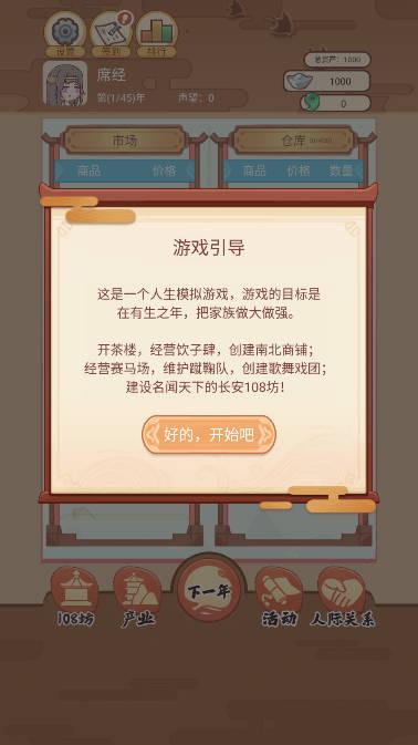唐朝人生无限金币无限金钱版(com.jys.sim.tang)是一款真实模拟玩法游戏,这是全新的无限金币版本分享,这里面的金币铜钱都是无限的模拟可以建造各种茶楼,开启你的商业人生,非常好玩!
