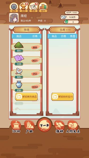 更况且针对于跑商来说明明还有更好的设计题材,游戏直接以丝绸之路为原型进行跑商玩法的设计岂不美哉?就现在单一的两个展示栏是真的有点小尴尬,还有就是在游戏当中买那么多房子也才攒一点点声望啊,想要去开一百零八坊或者说进行更高层次的游戏进度在我看来也就只能靠着不断传承下去来进行游戏的推进了。