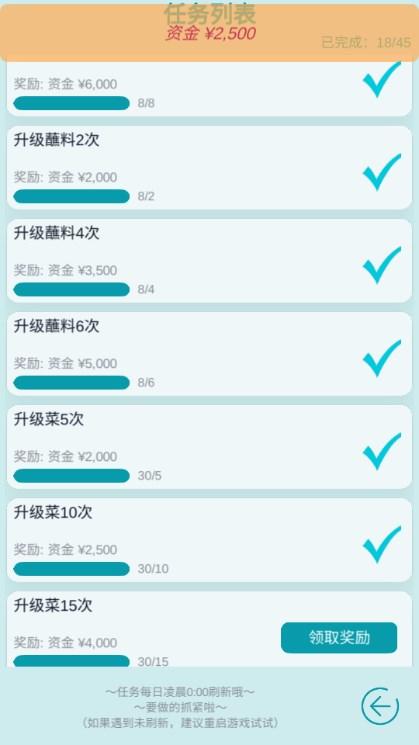 关卡目标均为赚取一定量金币,玩家通过完成顾客订单获得金币。顾客支付金币分为两部分——食物价格与小费。食物价格与材料等级有关,难以变动;小费与顾客等待值息息相关,等待值越低,小费越高。这就意味着玩家完成订单必须迅速,强调操作时的眼力与手速。