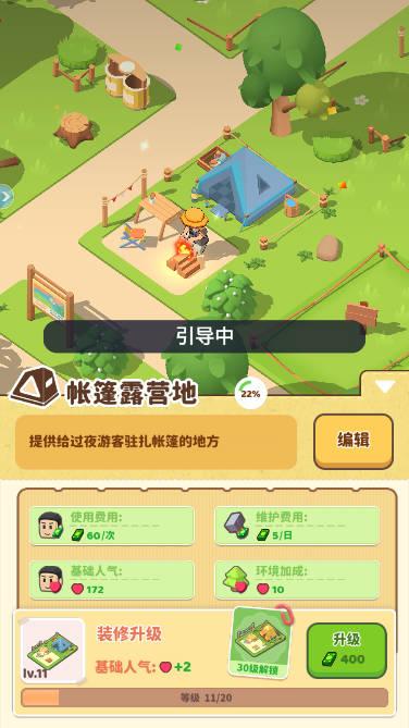 溜出去露营游戏是一款模拟休闲游戏,欢迎来到露营地狂热者,这是一款让您可以享受自然美景、轻松愉悦的露营冒险游戏!在这里,您可以自由地建造和定制自己的露营地,从一个小帐篷和篝火,到小木屋、娱乐区和游泳池,一步步打造出您梦想中的露营天堂。