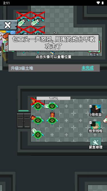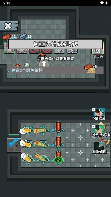 躺平打工人是一款好玩的休闲类的放置游戏,一起来体验放置的快乐,设定好之后,就可以防守不管了,快来下载游戏吧,展示你的究极摆烂。以打工人和包工头的对抗为主题,玩家可以在游戏里面选择打工人模式或者包工头模式进行挑战,扮演打工人需要快速进入房间中搬砖发展经济,放置炮塔,抵御包工头的进攻,扮演包工头则需要不断地提升自我技能,攻破所有打工人的房门!