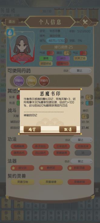 功法:高稀有度的功法会多一条词缀,越高稀有度的词缀越多,一般没有像金灵之体的特性的话,直接给功法一栏挂上你想加的属性就可以不管了,但是像有金灵之体等特性就必须精心培养了,因为他们的功法属性对上的话是双倍效果。