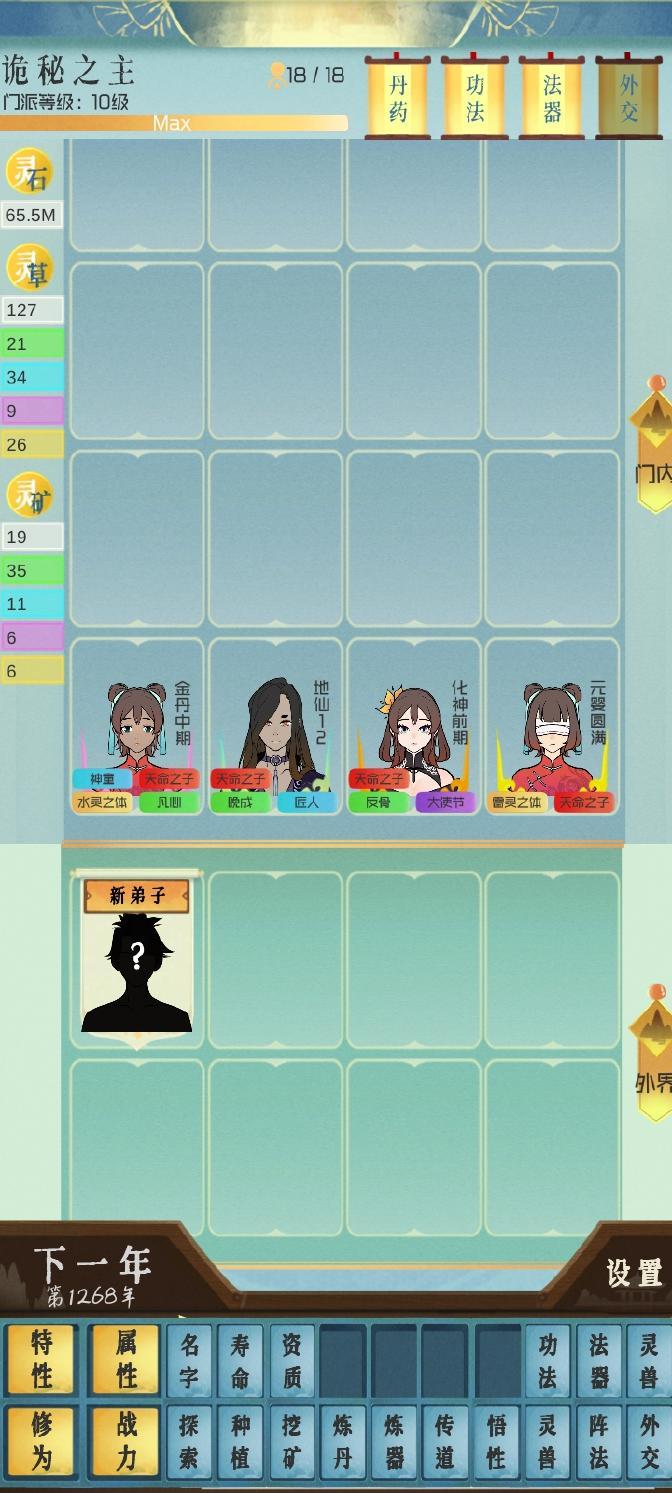 天地灵气复苏,让你来经营这个起步只有凡人境的小小小门派,招募弟子,派遣弟子完成各类任务或者事件,分配好你的丹药,功法,法器,来帮助你的弟子们修行。