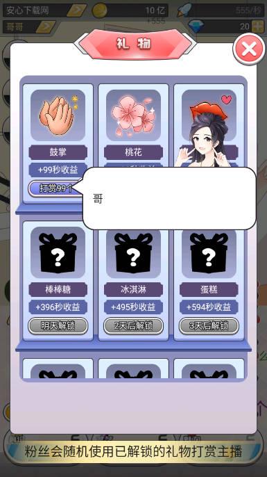 休闲+模拟+养成+沙盒+galgame+经营,这个游戏的功能真的有这么全吗?似乎的确有这么全。看看宣传图,足足有20页,里面真的有很多的玩法,你可以去吃个饭,约个朋友,住下酒店,买件衣服,买个游戏,进行直播。直播有很多的功能,从宣传图和作者新发的帖子就可以看出,的确是包含了很多直播软件所拥有的大多功能。你可以打榜啦,发红包啦,PK其他主播啦,查看主播排行榜啦什么的。可以说,还原得算是80%左右了!