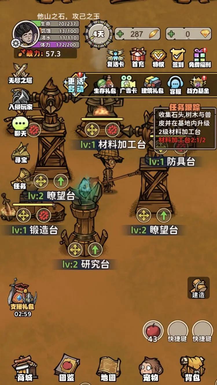 开门就几种氪金弹窗,食物少的一塌糊涂,前期基本上会因为食物短缺而死或者大部分时间用于收集食物而丧失游戏体验。而且任务设置的不是很合理,一步步跟着任务流程走,直到我引入到了副本里,然后连里面的小怪都打不过,这个任务是来搞笑的吗?目前玩到这里,弃坑了。目测为不专注游戏体验的偷饥荒皮的骗氪游戏。