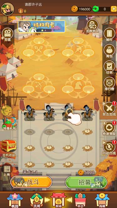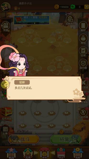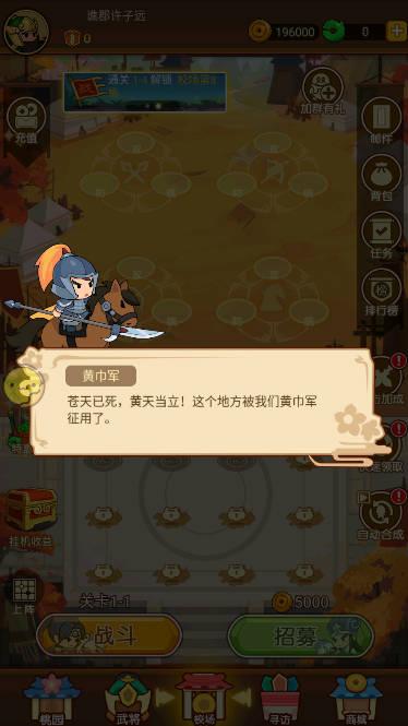 1.是一个可爱的三国武将。一切我们认识的将军都会呈现。最多能够招募和选拔一百多名将军。